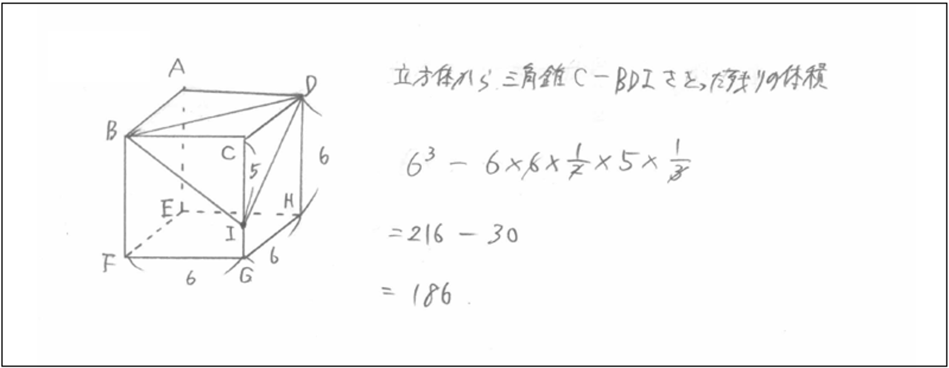 ① 気づき 問題を読むとすぐ計算を始めてしまい、図を書かない。条件も書き込まない。途中式もほとんど残っていないため、途中で分からなくなり「難しい問題だった」と感じてしまう。本来解ける問題でも、自分の中で整理できないまま終わることが多かった。答案には考えた痕跡がほとんど残っていない。 まず図を丁寧に描く。見える辺は実線、見えない辺は点線で表す。問題文の条件を図に書き込み、必要な長さや角度を整理する。その後に途中式を順番に書きながら計算する。答案には「何を考えて解いたか」が一目で分かる構造が残る。 「分からない」と思っていた問題の多くが、図と条件を書くだけで自然に解けることに気づく。問題が難しかったのではなく、見えていなかっただけだったと理解する。この瞬間、数学が怖い教科から「解けると面白い教科」へと変わる。